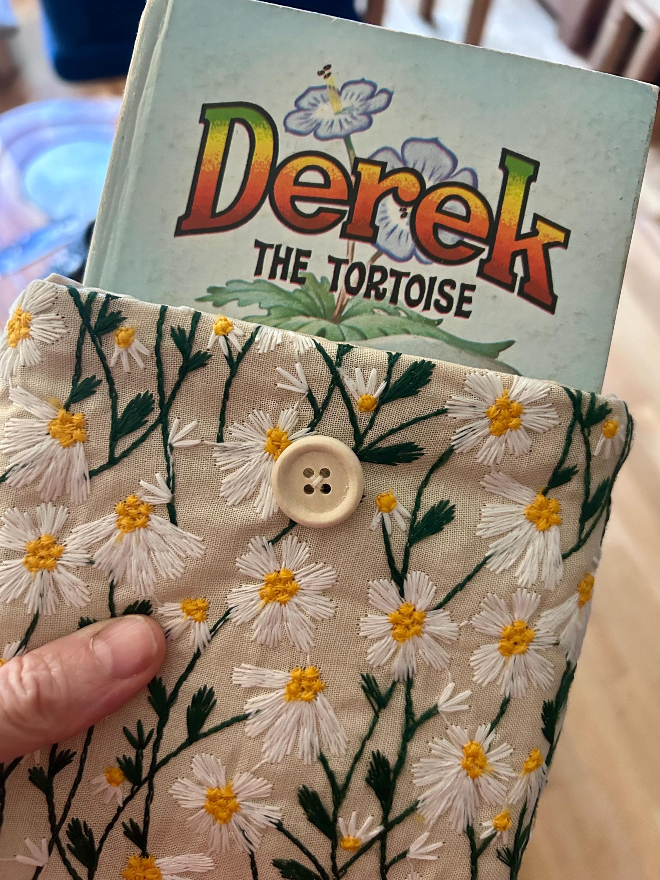 Padded book sleeve, ideal for protecting your books during travel. Lined with beige floral cotton fabric. Embroidered daisy fabric is one side only, plain cotton linen look on reverse side.